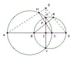 Let DN meet XY at Q. Angle QDZ = 90o - angle NBD = angle BPZ. So triangles QDZ and BPZ are similar. Hence QZ/DZ = BZ/PZ, or QZ = BZ·DZ/PZ. Let AM meet XY at Q'. Then the same argument shows that Q'Z = AZ·CZ/PZ. But BZ·DZ = XZ·YZ = AZ·CZ, so QZ = Q'Z. Hence Q and Q' coincide.