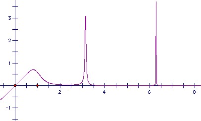 Obviously f(x) is positive for positive x. But it has an infinite number of spikes at x = nπ. The spike at nπ is height nπ, so we have to show that the integral is bounded above.