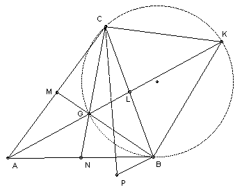 Applying the sine rule to triangle BGL, we have BG/sin BLG = BL/sin BGK. Similarly applying the sine rule to triangle CGL, we have CG/sin CLG = CL/sin CGK. But L is the midpoint of BC and sin BLG = sin CLG, so BG/CG = sin CGK/sin BGK.