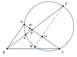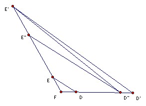 Now take D" on the ray FD such that D"F/DF = 4 and similarly take E" on the ray FE such that E"F/EF = 4. Then D"E" = 4DE. The triangle E'D"D' has ∠E'D"D' ≥ ∠EFD > 90o, so D'E' > D"E'. Similarly ∠EE"D" ≥ ∠EFD, so D"E' ≥ D"E" and hence D'E' ≥ 4DE. But AB + AC = AE' +AD' ≥ D'E'. Hence result.