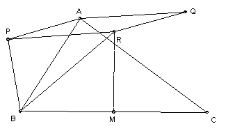 Put ∠RBC = x. Then RB = a/(2 cos x). Since angle P = angle R, we have ∠PBA = angle RBC = x, and so ∠PBR = ∠B. Also PB = c/(2 cos x). Similarly, AQ = b/(2 cos x).