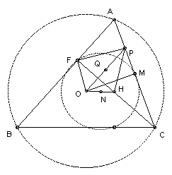 Let M be the midpoint of AC and Q the midpoint of OP. Then angle OFP = angle OMP = 90o, so Q is the midpoint of the circle through O, F, P, M. Let N be the midpoint of OH. Then N is the center of the nine-point circle through F, M (and other points). Both N and Q must lie on the perpendicular bisector of the common chord FM, so NQ is perpendicular to FM. Since N is the midpoint of OH and Q is the midpoint of OP, NQ is parallel to HP. Hence HP is perpendicular to FM. So angle FHP = 90o - angle MFH. But M is the center of the circle through A, F, C, so angle MFH = angle MFC = angle MCF = 90o - A. Hence angle FHP = angle A.