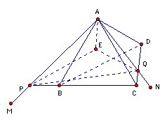 Let h be the distance of A from the plane BCD. Then the distance of A from the line PQ is at least h, so the point E exists provided that the side length is at most 2h. That is certainly true (in fact it is √(3/2) h).