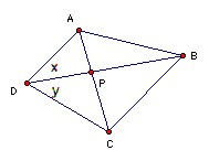 Now area APD = (AD·PD sin x)/2 and area CPD = CD·PD sin y)/2, so AP/PC = area APD/area CPD = (sin x/sin y)(AD/CD) = rational. But AP + PC is rational, so AP is rational. Similarly for the other segments.